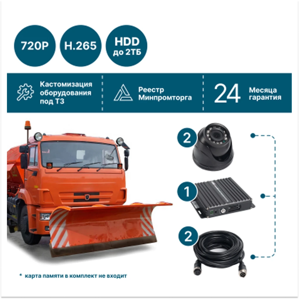 NSCAR ST201_HDD — комплект видеонаблюдения, созданный для работы на тяжёлой дорожной технике: бульдозерах, грейдерах, катках, асфальтоукладчиках, тракторах, дорожных фрезах и коммунальных машинах. Система обеспечивает запись в HD-качестве и поддерживает хранение данных как на HDD/SSD дисках до 2 ТБ, так и на SD-картах памяти до 512 ГБ. Это универсальное решение для контроля, безопасности и учёта работы дорожной спецтехники.